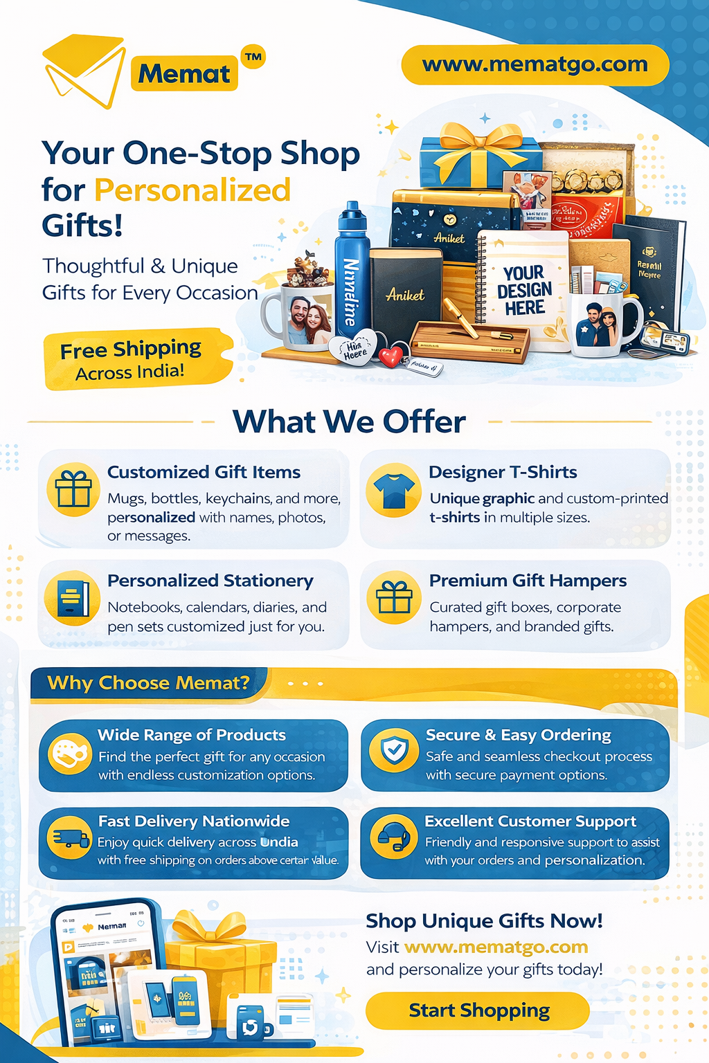 - Discover Mematgo, your one-stop shop for personalized gifts in India. Shop customized mugs, bottles, stationery, designer t-shirts, and premium gift hampers with free shipping across India.