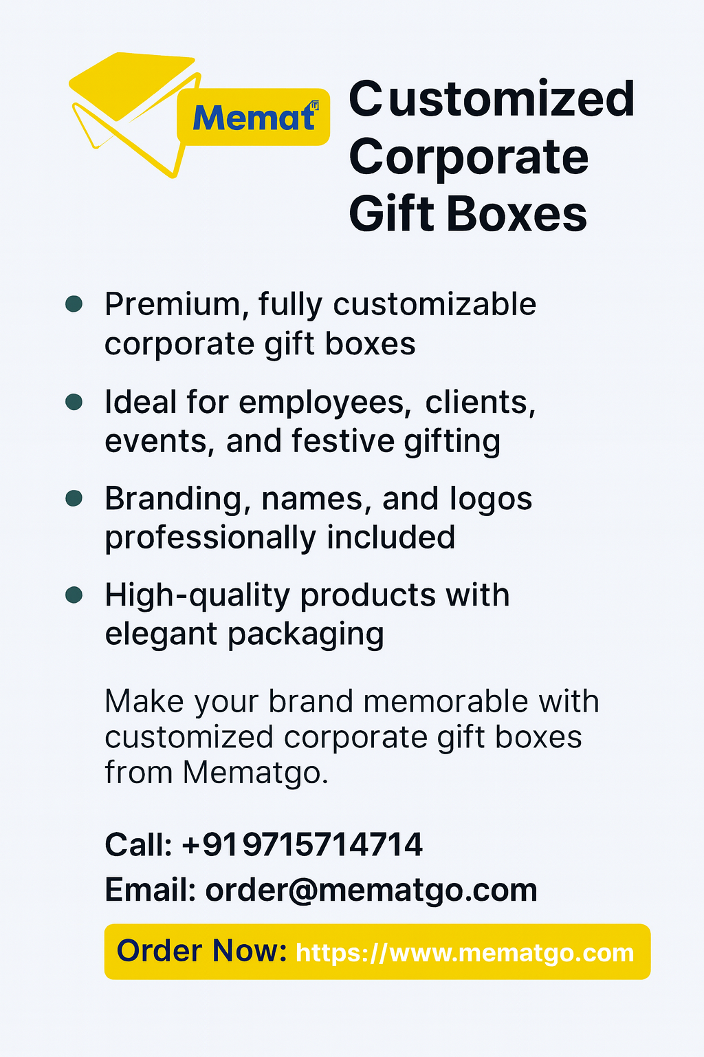 https://www.mematgo.com/collections/customize-corporate-gift-boxExplore premium corporate hampers, family gifts, wedding hampers, and personalized bottles. Buy customized gifts online from Mematgo with fast delivery. https://www.mematgo.com/collections/customize-corporate-gift-box0 Comments 0 Shares - Premium Customized Corporate & Family Gifts | Mematgo