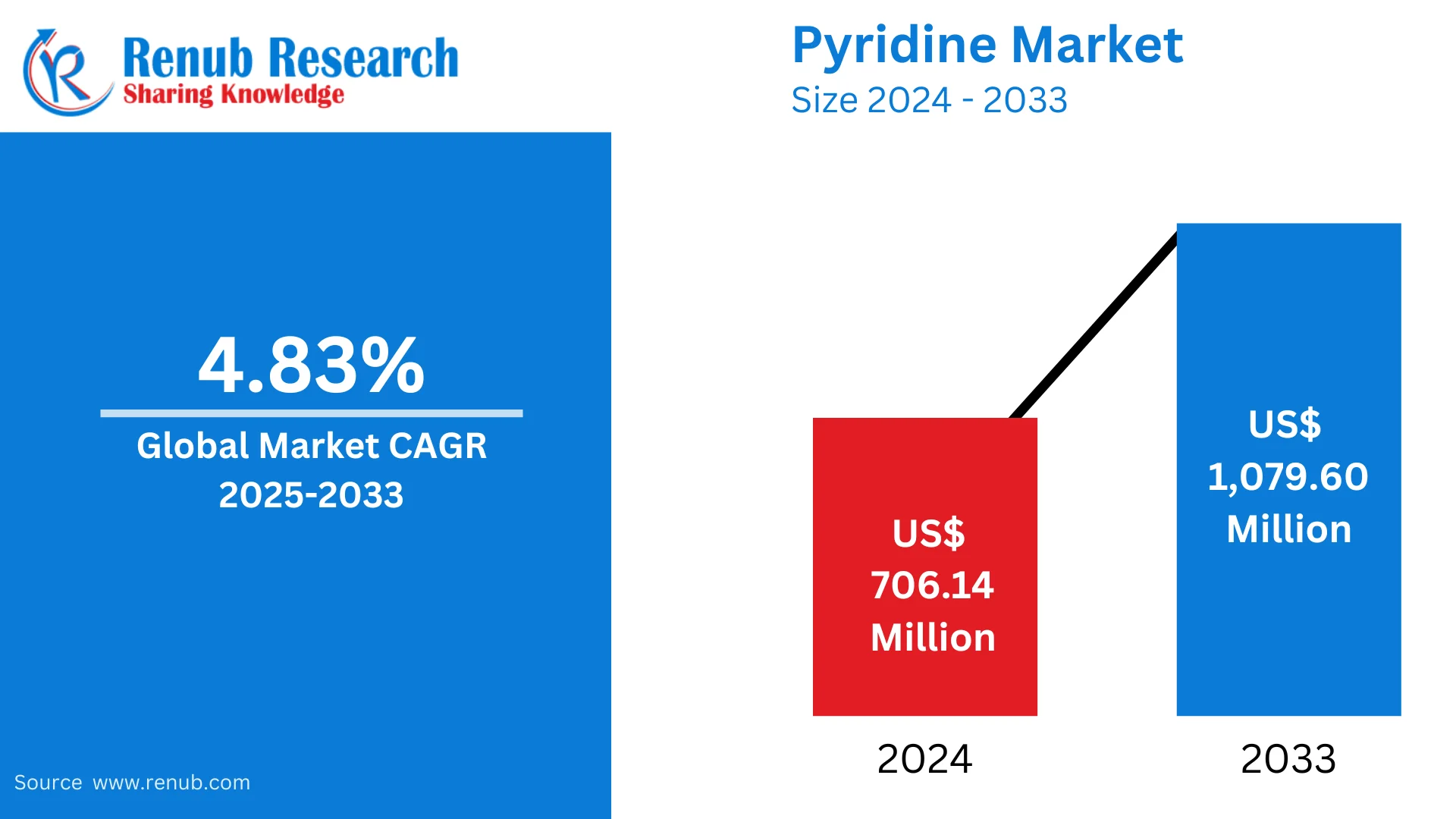 The Global Pyridine Market is projected to reach US$ 1,079.60 Million by 2033, rising from US$ 706.14 Million in 2024, exhibiting a CAGR of 4.83% during the forecast period of 2025 to 2033. Pyridine, a basic heterocyclic organic compound (C5H5N), plays a vital role across multiple industries due to its versatile chemical properties. Its increasing demand is fueled by its wide application in pharmaceuticals, agrochemicals, dyes, food flavoring agents, and more.