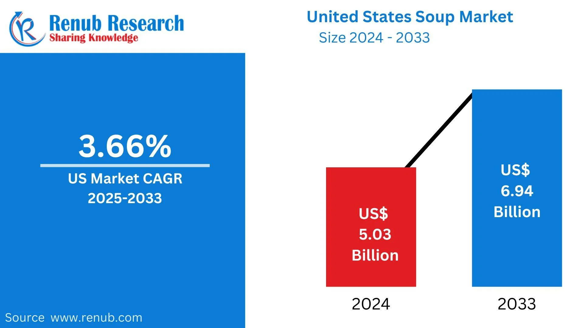 The United States Soup Market is projected to grow from US$ 5.03 billion in 2024 to US$ 6.64 billion by 2033, reflecting a CAGR of 3.66% from 2025 to 2033. This growth is driven by evolving consumer demands for convenient, healthy, and varied meal solutions, with an increasing preference for ready-to-eat (RTE) soups and plant-based options. Below is a detailed analysis of the factors shaping this market, including trends, drivers, challenges, and forecasts across various product segments and regions.