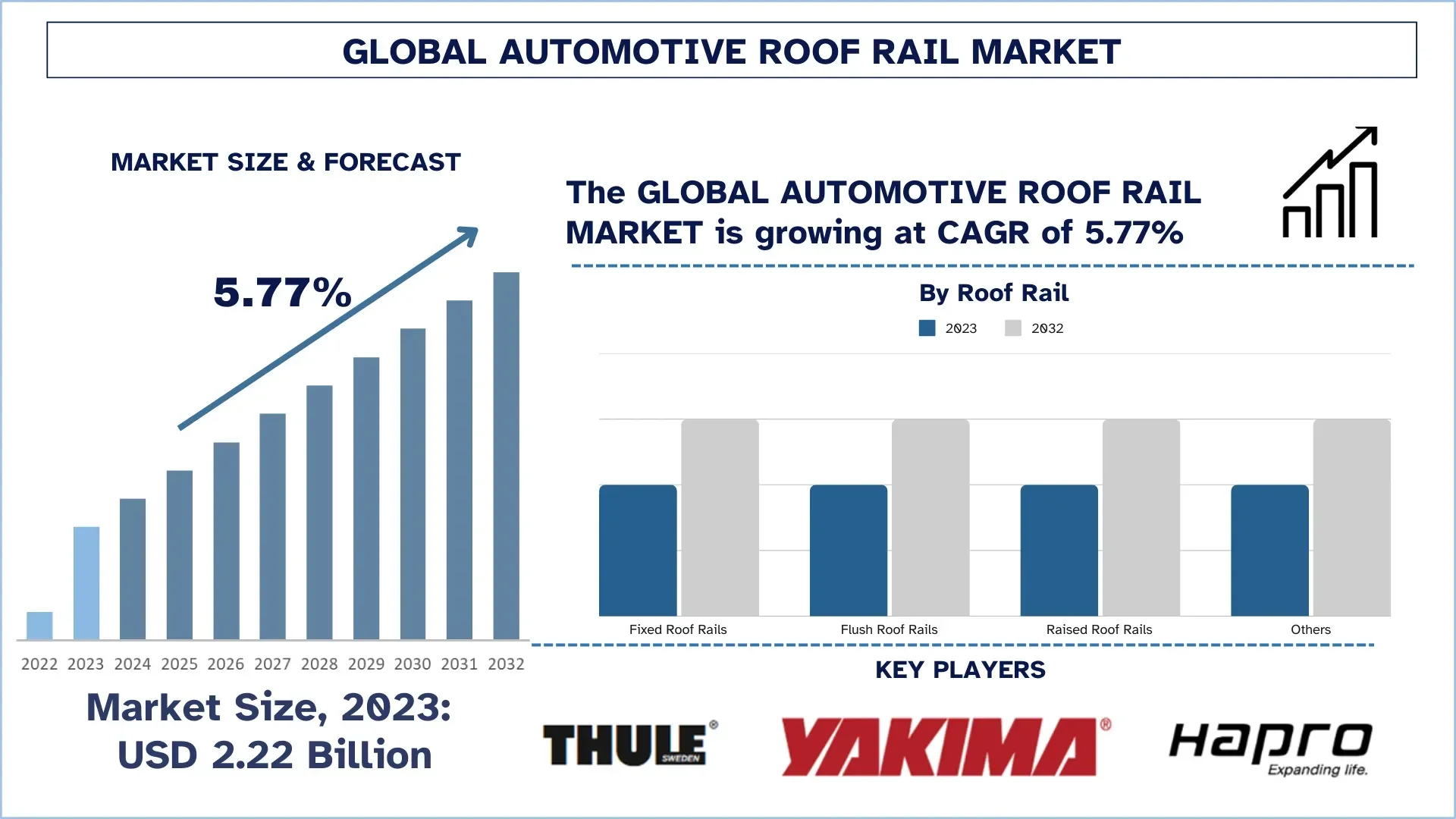 According to the UnivDatos, as per their “Automotive Roof Rail Market” report, the global market was valued at USD 2.22 billion in 2023, growing at a CAGR of about 5.77% during the forecast period from 2024-2032 to reach USD billion by 2032.