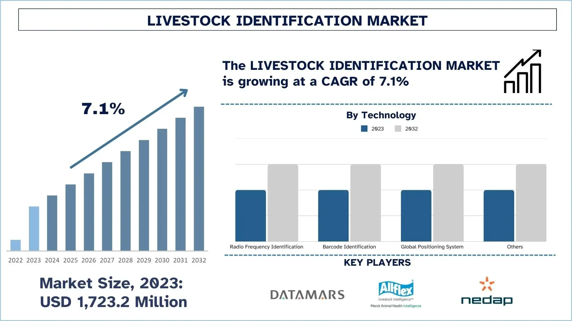 According to UnivDatos, strict government regulations for traceability and disease control, along with the growing adoption of RFID and IoT-based tracking for efficient herd management will drive the global scenario of the Livestock Identification market. As per their “Livestock Identification Market” report, the global market was valued at USD 1,723.2 Million in 2023, growing at a CAGR of 7.1% during the forecast period from 2024 - 2032 to reach USD Million by 2032.