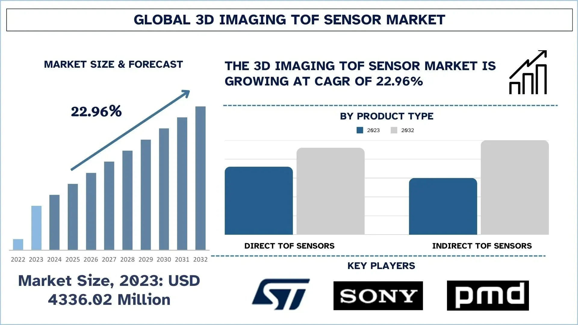 According to the UnivDatos, the rising adoption of AR/VR, facial recognition, and 3D scanning in consumer electronics, along with increased application in industrial automation and robotics, are driving the growth of the 3D Imaging ToF Sensor market worldwide. As per their “3D Imaging ToF Sensor Market” report, the global market was valued at USD 4336.02 million in 2023, growing at a CAGR of about 22.96% during the forecast period from 2024 - 2032 to reach USD million by 2032.