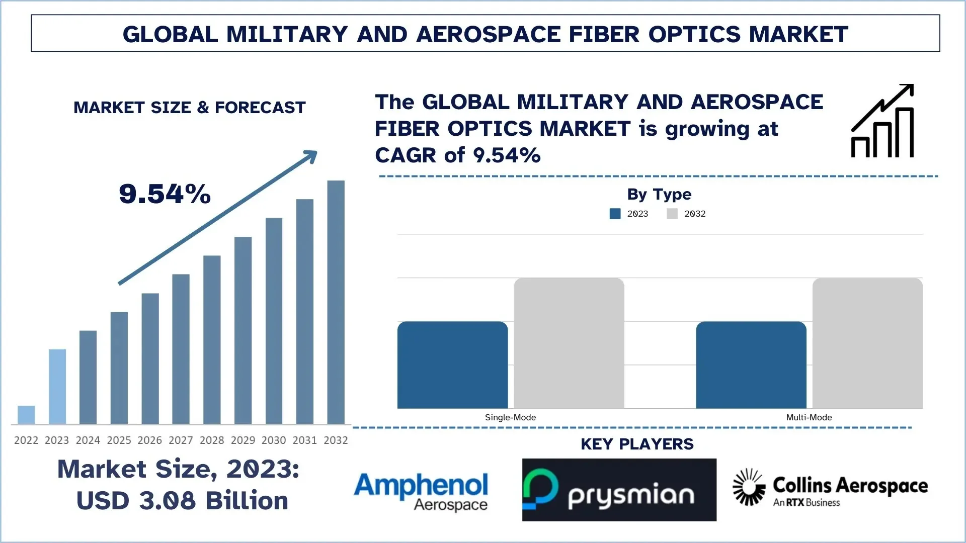 According to the UnivDatos, as per their “Military and Aerospace Fiber Optics Market” report, the global market was valued at USD 3.08 billion in 2023, growing at a robust CAGR of 9.54% during the forecast period from 2024-2032 to reach USD 6.83 billion by 2032.