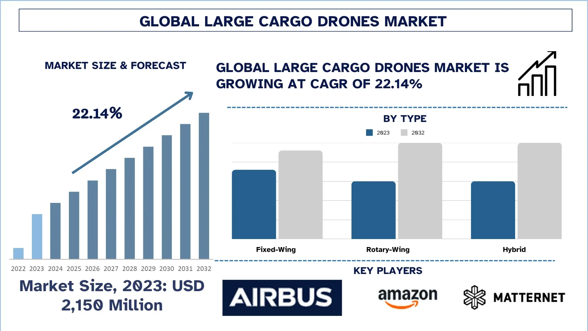 According to the UnivDatos, growing investments in Large Cargo Drones for effectively conducting the deliveries of cargo by the commercial sector will drive the global scenario of the “Global Large Cargo Drones Market” report; the global market was valued at USD 2,150 million in 2023, growing at a CAGR of 22.14% during the forecast period from 2024 - 2032 to reach USD million by 2032.