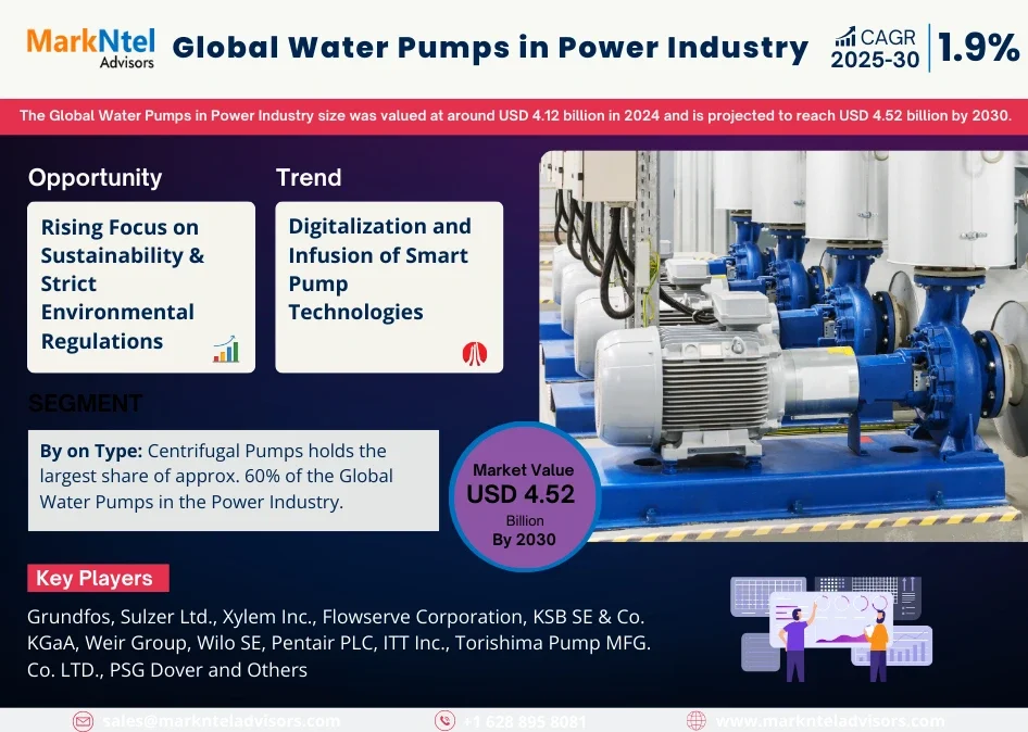 MarkNtel Advisors Research Analyses that Water Pumps in Power Industry size was valued at around USD 4.12 billion in 2024 and is projected to reach USD 4.52 billion by 2030. Along with this, the market is estimated to grow at a CAGR of around 1.9% during the forecast period, i.e., 2025-30.