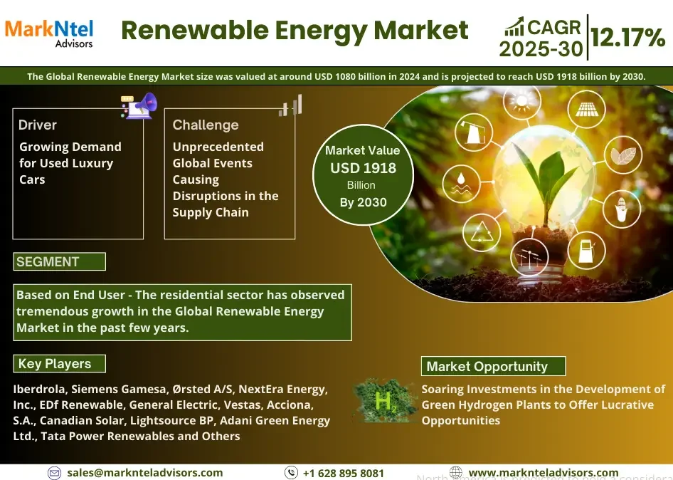 MarkNtel Advisors Research Analyses that Renewable Energy Market size was valued at around USD 1080 billion in 2024 and is projected to reach USD 1918 billion by 2030. Along with this, the market is estimated to grow at a CAGR of around 12.17% during the forecast period, i.e., 2025-30.