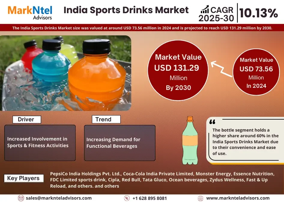 MarkNtel Advisors Research Analyses that Indian Sports Drinks Market size was valued at around USD 73.56 million in 2024 and is projected to reach USD 131.29 million by 2030. Along with this, the market is estimated to grow at a CAGR of around 10.13% during the forecast period, i.e., 2025-30.