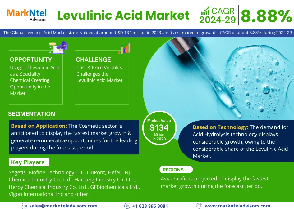 MarkNtel Advisors Research Analyses that Levulinic Acid Market size is valued at around USD 134 million in 2023 and is estimated to grow at a CAGR of about 8.88% during the forecast period, i.e., 2024-29.