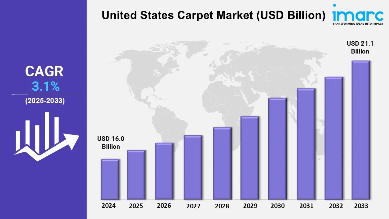 The United States carpet market size reached USD 16.0 Billion in 2024. Looking forward, IMARC Group expects the market to reach USD 21.1 Billion by 2033, exhibiting a growth rate (CAGR) of 3.1% during 2025-2033.