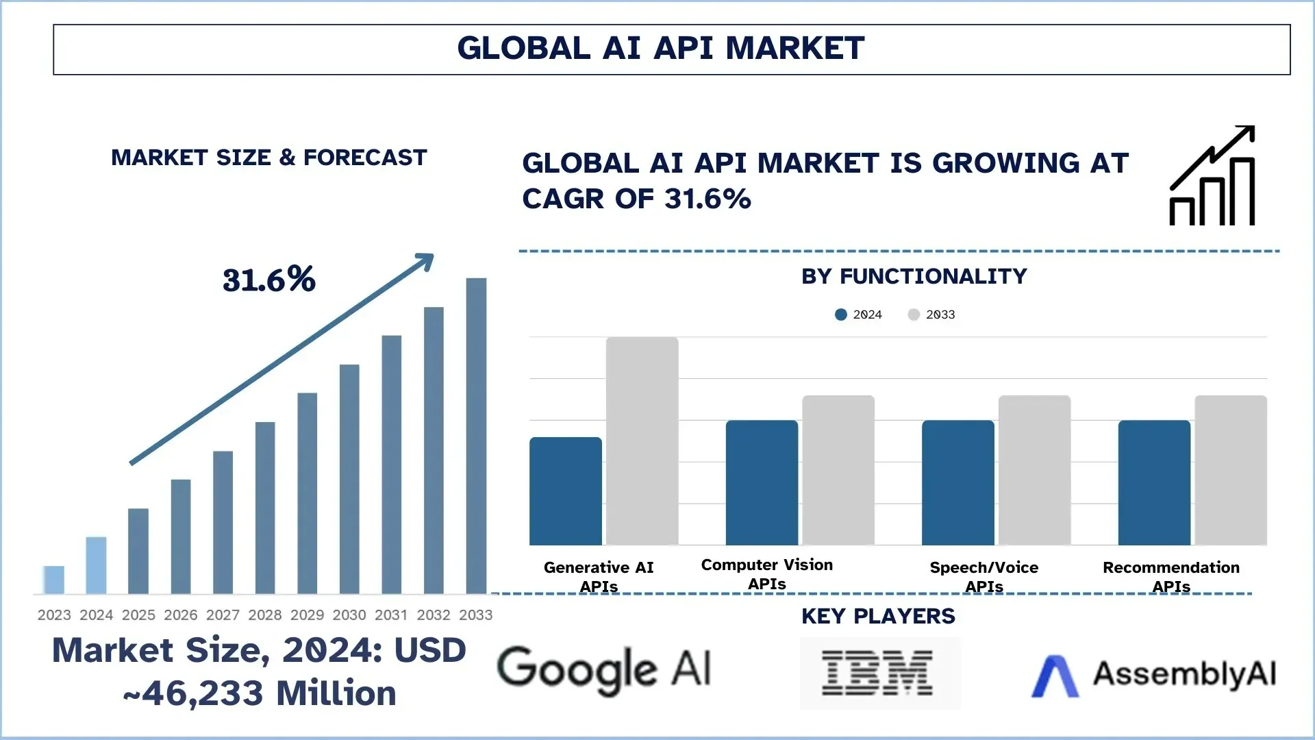 According to the UnivDatos, the rising integration of AI APIs from the end-user industries would fuel the demand for AI API is further anticipated to grow. As per their “AI API Market” report, the global market was valued at USD 46,233 million in 2024, growing at a CAGR of about 31.6% during the forecast period from 2025 - 2033 to reach USD million by 2033.