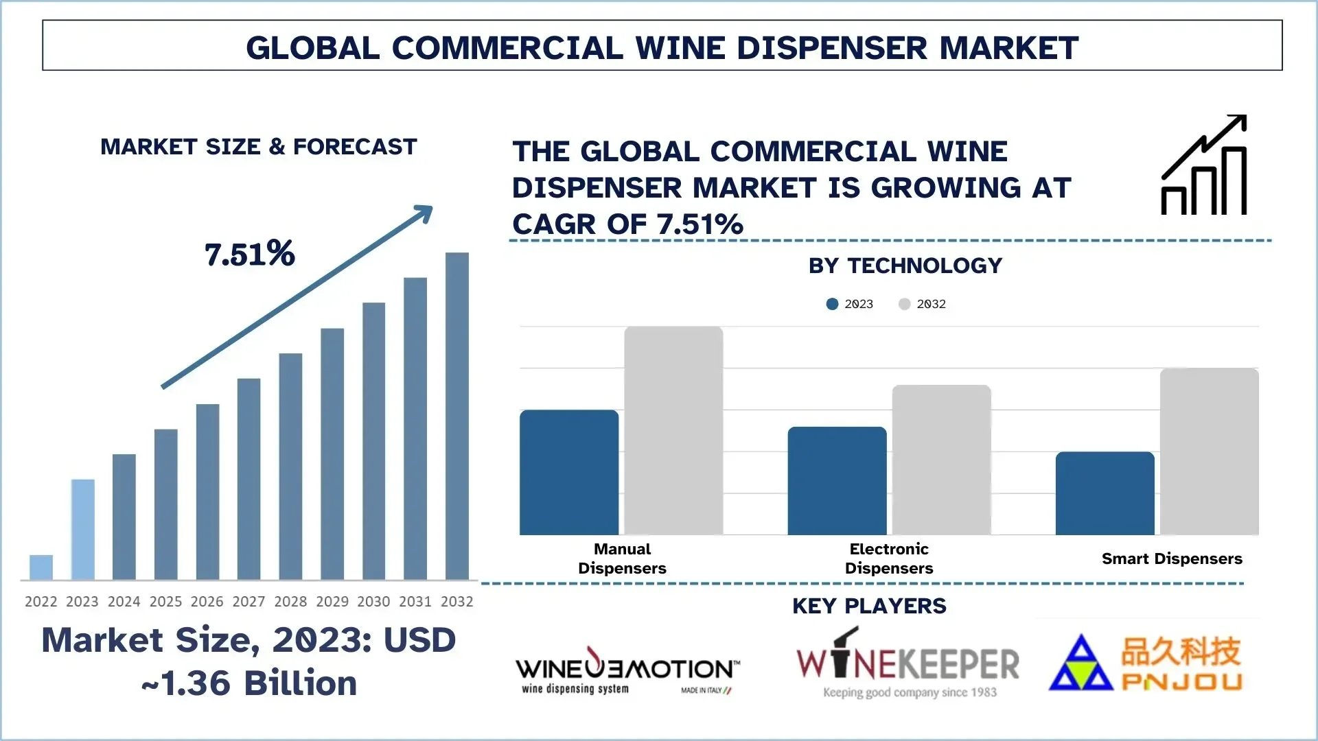 According to the UnivDatos, the enhanced wine preservation and reduced waste, elevated customer experience and increased sales, automation and efficiency in operations, and technological advancements and integration will drive the global scenario of the Commercial Wine Dispenser market. As per their “Commercial Wine Dispenser Market” report, the global market was valued at USD 1.36 billion in 2023, growing at a CAGR of about 7.51% during the forecast period from 2024 - 2032 to reach USD billion by 2032.