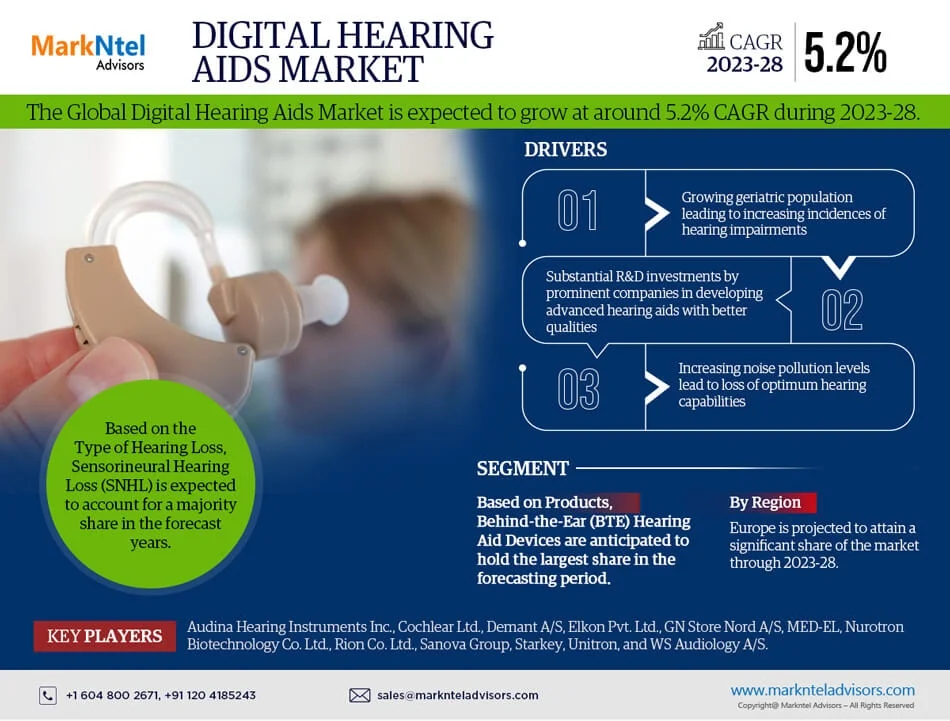 MarkNtel Advisors Research Analyses that Digital Hearing Aids Market projected to grow at a CAGR of around 5.2% during the forecast period, i.e., 2023-28.