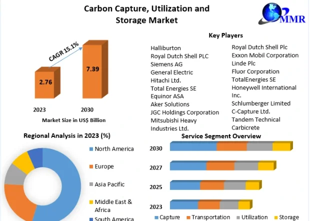 Carbon Capture, Utilization and Storage Market was valued at USD 2.76 Billion in 2023, and is expected to reach USD 7.39 Billion by 2030, exhibiting a CAGR of 15.1% during the forecast period (2024-2030)