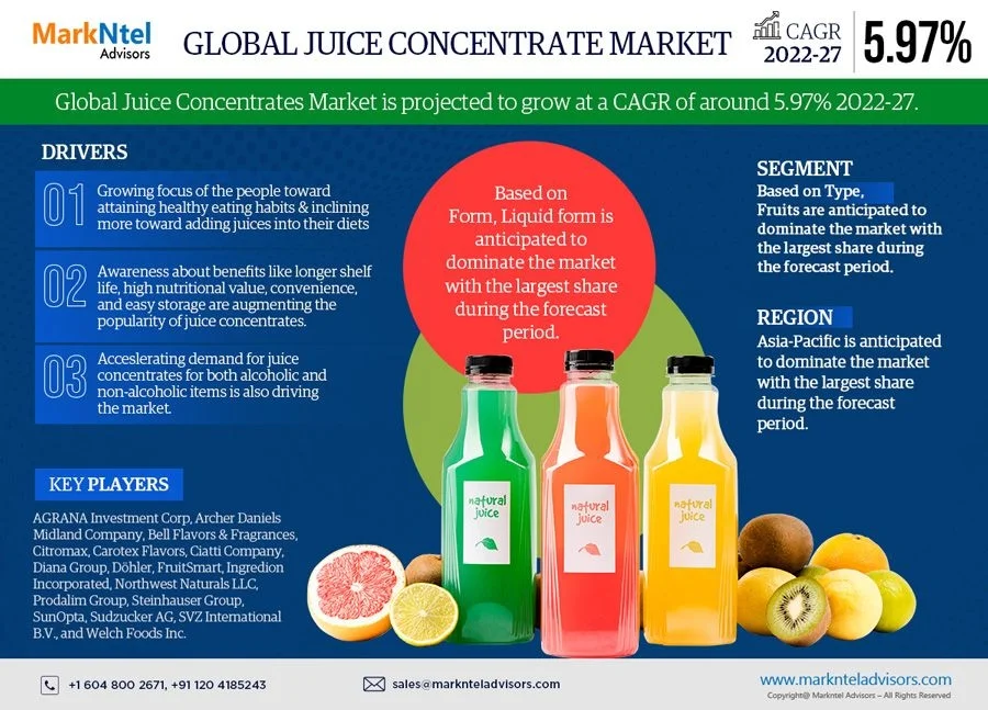 MarkNtel Advisors Research Analyses that Juice Concentrates Market is projected to grow at a CAGR of around 5.97% during the forecast period, i.e., 2022-27. The growth of the market is likely to be driven primarily by the mounting focus of people on healthy eating & their growing inclination toward adding juices to their diet.