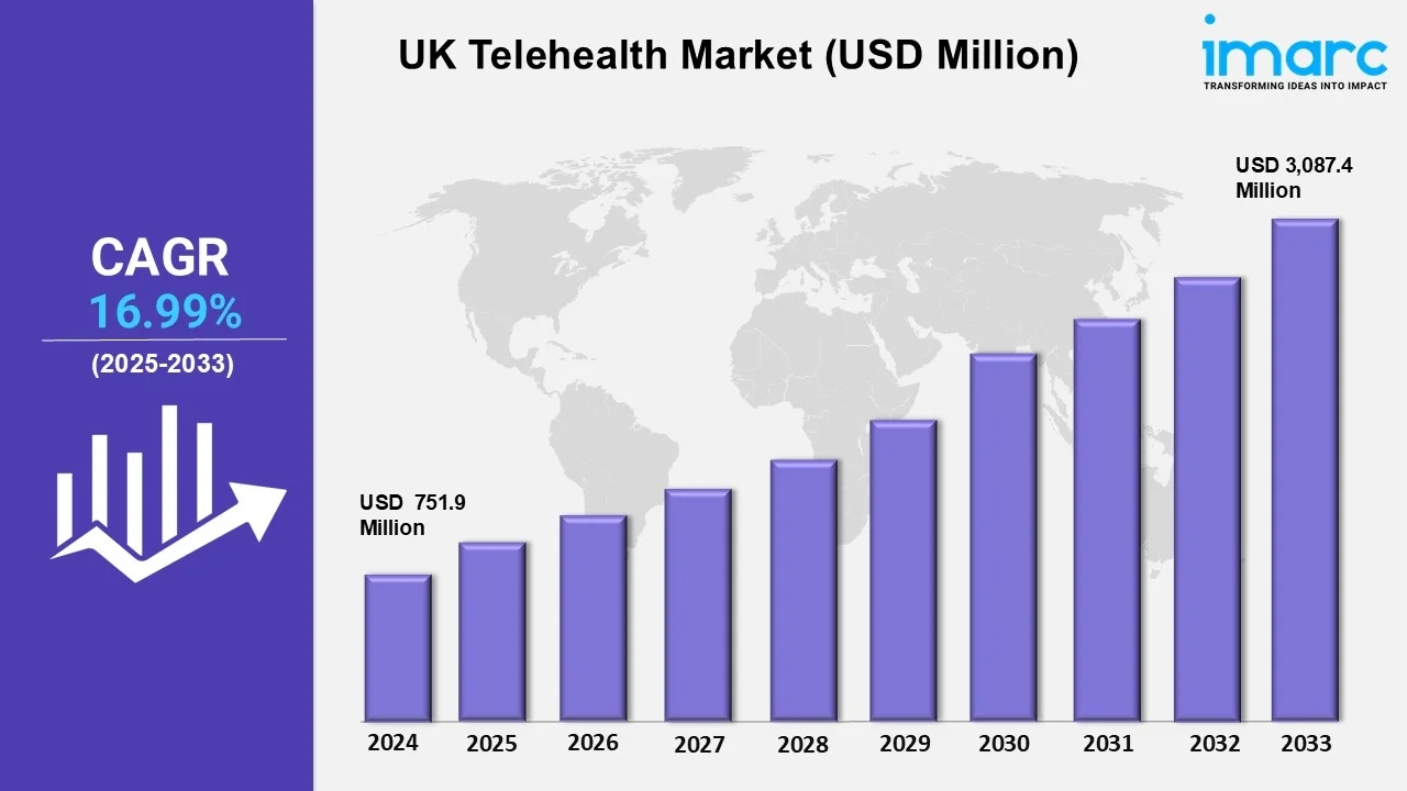 According to IMARC Group's report titled "UK Telehealth Market Report and Forecast 2025-2033," the market reached USD 751.9 million in 2024. Looking forward, IMARC Group expects the market to reach USD 3,087.4 million by 2033, exhibiting a growth rate (CAGR) of 16.99% during 2025-2033.