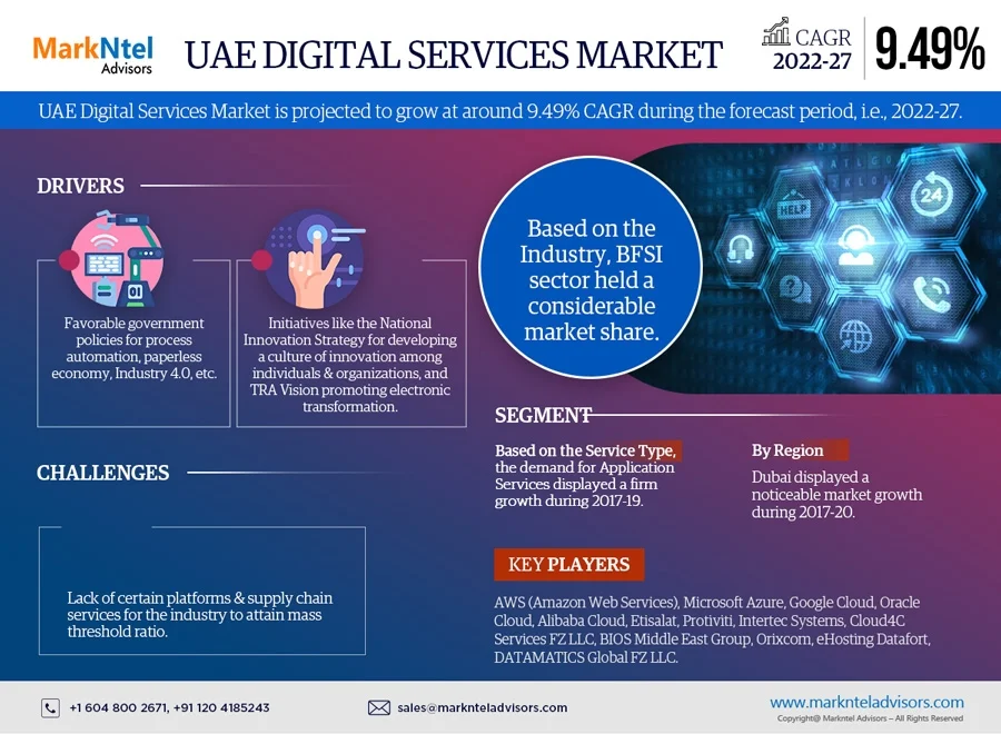 MarkNtel Advisors Research Analyses that UAE Digital Services Market is projected to grow at around 9.49% CAGR during the forecast period, i.e., 2022-27.