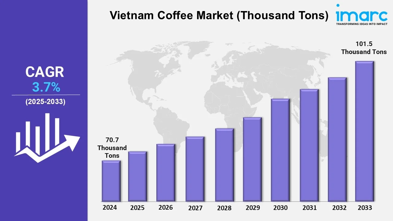 Vietnam coffee market size reached 70.7 Thousand Tons in 2024. Looking forward, IMARC Group expects the market to reach 101.5 Thousand Tons by 2033, exhibiting a growth rate (CAGR) of 3.7% during 2025-2033.