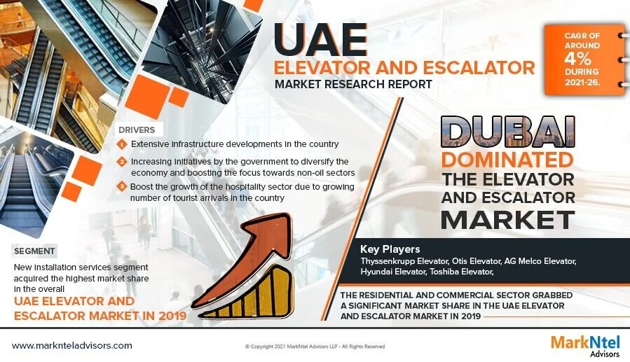 MarkNtel Advisors Research Analyses that UAE Elevator and Escalator Market is anticipated to grow at a CAGR of around 4% during the forecast period, i.e., 2021-26.