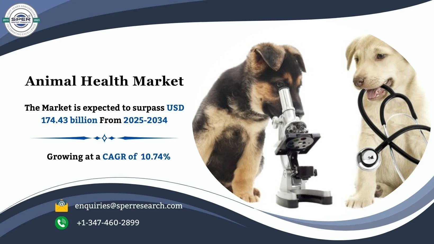 According to SPER Market Research, ‘Global Animal Health Market Size - By Product, By Animal Type, By Distribution Channel, By End User - Regional Outlook, Competitive Strategies and Segment Forecast to 2034’ state that the Global Animal Health Market is estimated to reach USD 174.43 billion by 2034 with a CAGR of 10.74%.