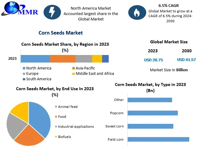 The Corn Seeds Industry, valued at USD 26.75 billion in 2023, is projected to grow to USD 41.57 billion by 2030, expanding at a CAGR of 6.5% during the forecast period. Corn, often referred to as the “queen of cereals,” is cultivated in over 166 countries worldwide, spanning tropical, subtropical, and temperate regions. With a global cultivation area of around 205 million hectares and production exceeding 1,210 million tonnes, corn stands as one of the most vital cereal crops globally, serving essential roles in food, feed, and industrial sectors.