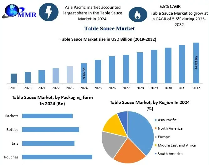 The Table Sauce Industry is witnessing dynamic growth, with the market valued at USD 9.66 billion in 2024 and projected to reach nearly USD 14.83 billion by 2032, expanding at a CAGR of 5.5%. This growth is fueled by evolving consumer preferences, increasing demand for global cuisines, and a rising focus on healthier, clean-label options in condiments.