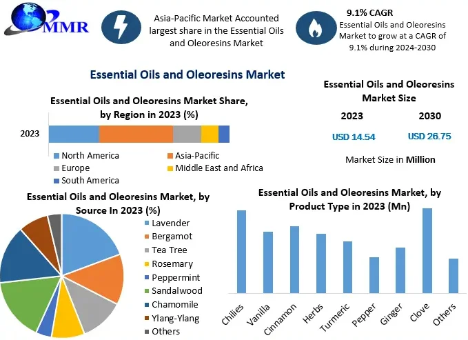 The Essential Oils and Oleoresins Industry was valued at USD 14.54 billion in 2023 and is projected to reach nearly USD 26.75 billion by 2030, growing at a robust CAGR of 9.1% during the forecast period. Essential oils are concentrated extracts obtained from plant sources through steam distillation, known for their aromatic and therapeutic properties. Oleoresins are semi-solid extracts derived from spices and herbs, combining essential oils and resins, widely used to enhance flavor and fragrance in culinary, cosmetic, and pharmaceutical applications.