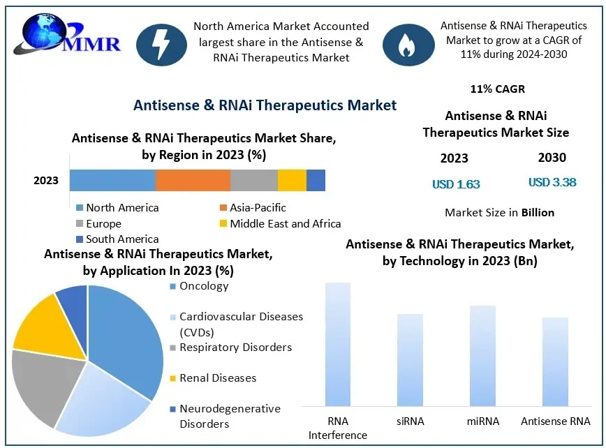 Antisense and RNAi Therapeutics Market was valued at US$ 1.63 Bn. in 2023 and is expected to reach US$ 3.38 Bn. by 2030, at a CAGR of 11% during the forecast period of 2024 to 2030.