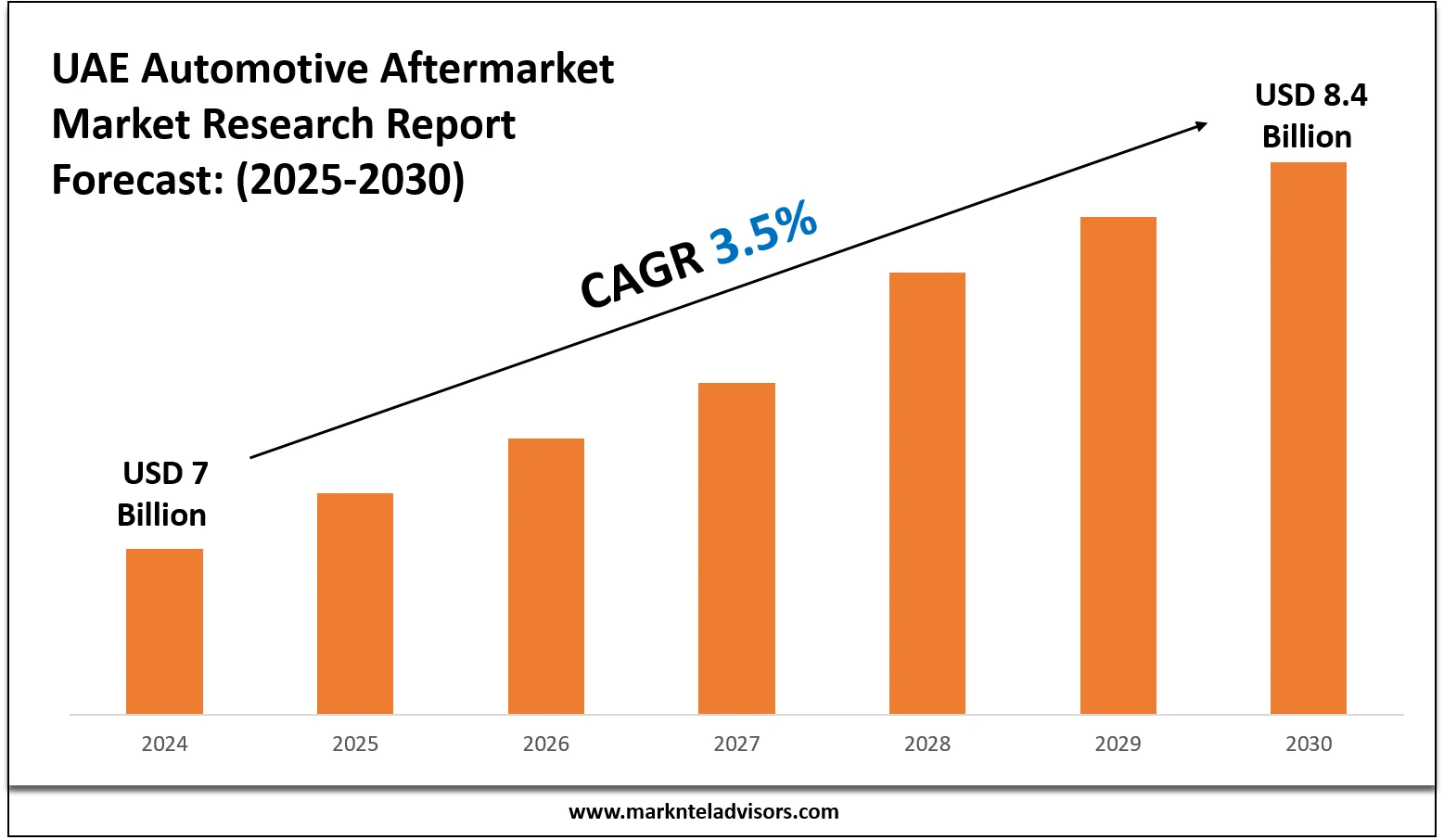 MarkNtel Advisors Research Analyses that The UAE Automotive Aftermarket Market size was valued at around USD 7 billion in 2024 and is projected to reach USD 8.4 billion by 2030. Along with this, the market is estimated to grow at a CAGR of around 3.5% during the forecast period, i.e., 2025-30.