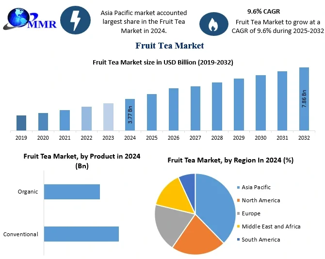 The Fruit Tea Industry was valued at USD 3.77 billion in 2024 and is projected to grow at a CAGR of 9.6% from 2025 to 2032, reaching approximately USD 7.86 billion by 2032. Fruit tea refers to beverages made by infusing hot or cold water with a blend of fruits, herbs, flowers, and botanicals. Known for their natural flavors, refreshing taste, and health benefits, fruit teas are increasingly positioned as healthier alternatives to traditional carbonated and caffeinated beverages.