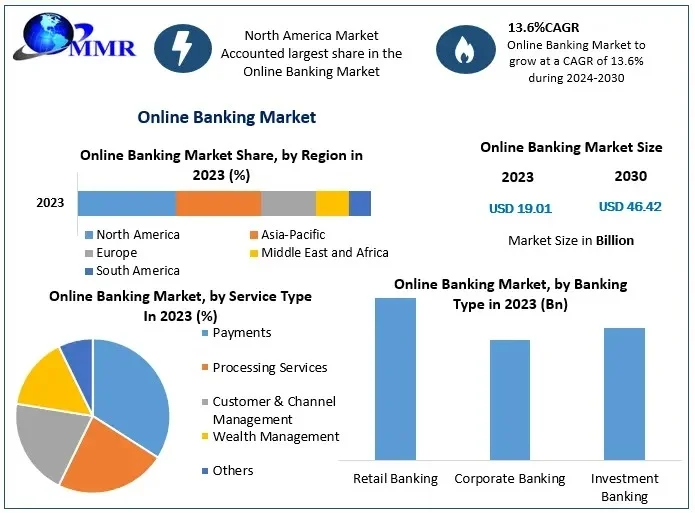 Online Banking Market was valued at US$ 19.01 Bn. in 2023 and is expected to reach US$ 46.42 Bn. by 2030, at a CAGR of 13.6% during a forecast period.