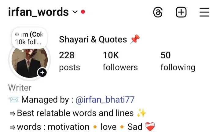 If you’re someone who feels deeply and believes in the power of words, @irfan_words is the perfect Instagram page for you. This space is dedicated to heartfelt Shayari & Quotes that reflect love, pain, hope, and every emotion in between.