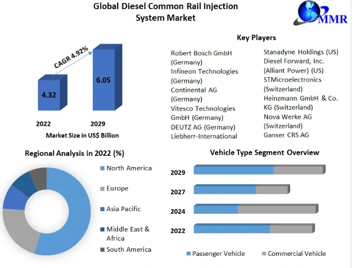 Diesel Common Rail Injection System Market was valued at USD 4.32 Billion in 2022, and it is expected to reach USD 6.05 Billion by 2029, exhibiting a CAGR of 4.92 % during the forecast period (2023-2029)