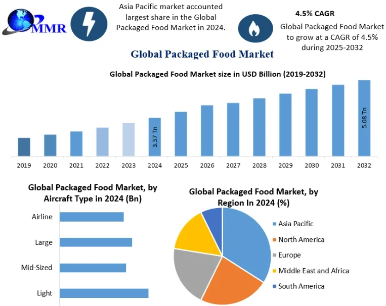 The Packaged Food Industry is witnessing significant expansion, valued at approximately USD 3.57 trillion in 2024, and projected to reach around USD 5.08 trillion by 2032, growing at a steady CAGR of 4.5% during the forecast period. Packaged food refers to pre-processed and sealed food products designed for convenience, safety, and longer shelf life, spanning categories such as ready-to-eat meals, snacks, bakery products, beverages, and frozen foods.