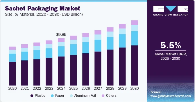The global sachet packaging market size was valued at USD 9.82 billion in 2024 and is anticipated to reach USD 13.52 billion by 2030, expanding at a CAGR of 5.5% from 2025 to 2030. The market's growth is primarily fueled by increasing demand for economical and convenient packaging options, expansion in the fast-moving consumer goods (FMCG) sector, and continuous innovations in packaging technologies.