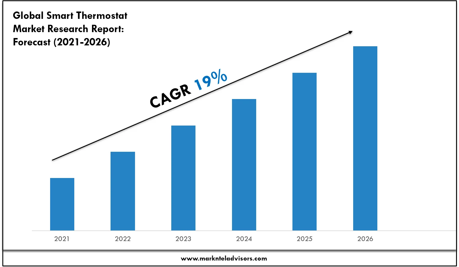 According to the latest report, Smart Thermostat Market is anticipated to grow at a CAGR of around 19% during the forecast period, i.e., 2021-26. The report significantly addressed considerable changes, gap analyses, and competitive studies using qualitative and quantitative data. These include the widespread segmentation, geography, and recent developments, entailing information on the fluctuation in the demand, sales, revenue, and other parameters experienced and expected in the industry for the forecasting year i.e. 2021 to 2026.