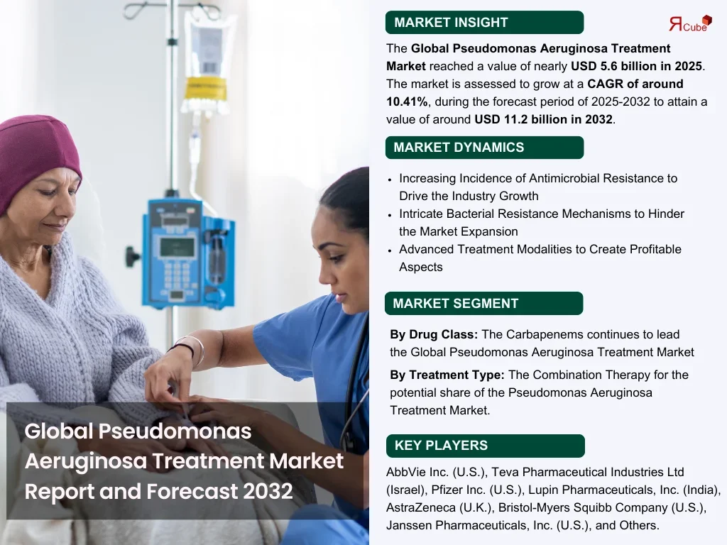 According to the latest report by The Report Cube, The Pseudomonas Aeruginosa Treatment Market reached a value of nearly USD 5.6 billion in 2025. The market is assessed to grow at a CAGR of around 10.41%, during the forecast period of 2025-2032 to attain a value of around USD 11.2 billion in 2032.