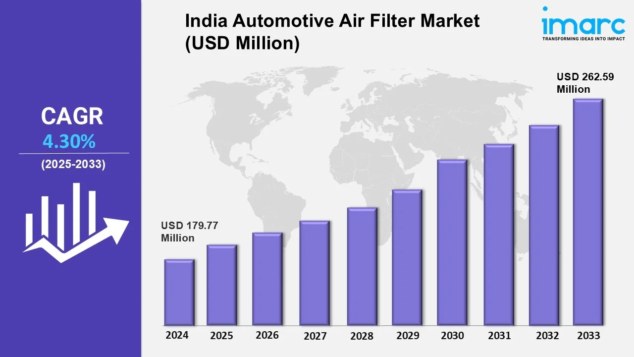 According to IMARC Group's report titled "India Automotive Air Filter Market Report and Forecast 2025-2033," the market reached USD 179.77 million in 2024. Looking forward, IMARC Group expects the market to reach USD 262.59 million by 2033, exhibiting a growth rate (CAGR) of 4.30% during 2025-2033.