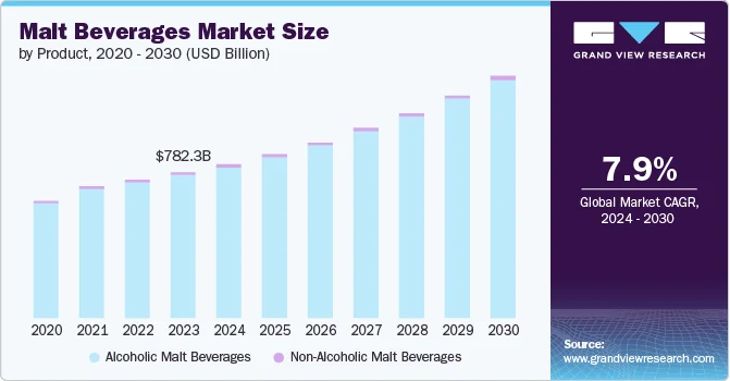 The global malt beverages market size was estimated at USD 782.25 billion in 2023 and is projected to reach USD 1,300.60 billion by 2030, growing at a CAGR of 7.9% from 2024 to 2030. The market is witnessing strong momentum due to shifting consumer preferences and innovative product developments. A growing number of consumers are exploring diverse and novel flavors, leading to the surge in flavored malt beverages (FMBs) and hard seltzers, which are being frequently introduced by brands aiming to meet evolving tastes.