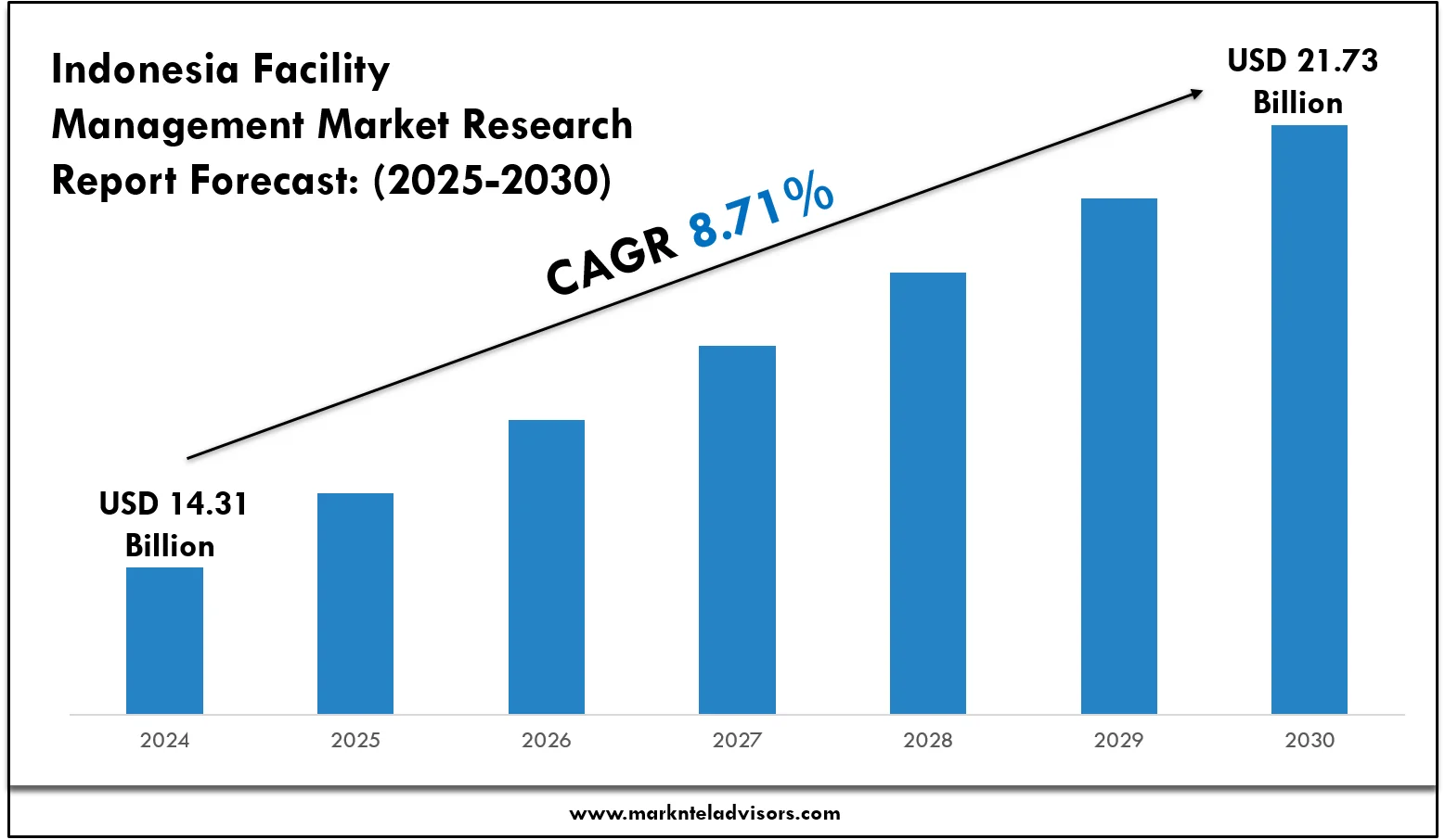 The Indonesia Facility Management Market size was valued at around USD 14.31 billion in 2025 and is projected to reach USD 21.73 billion by 2030. Along with this, the market is estimated to grow at a CAGR of around 8.71% during the forecast period, i.e., 2025-30.