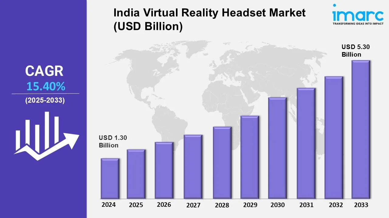 According to IMARC Group's report titled "India Virtual Reality Headset Market Report and Forecast 2025-2033," the market reached USD 1.30 billion in 2024. Looking forward, IMARC Group expects the market to reach USD 5.30 billion by 2033, exhibiting a growth rate (CAGR) of 15.40% during 2025-2033.