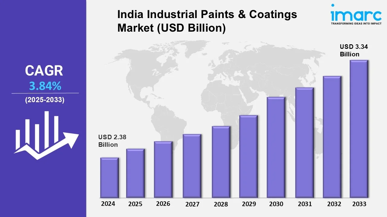 According to IMARC Group's report titled "India Industrial Paints & Coatings Market Report and Forecast 2025-2033," the market reached USD 2.38 billion in 2024. Looking forward, IMARC Group expects the market to reach USD 3.34 billion by 2033, exhibiting a growth rate (CAGR) of 3.84% during 2025-2033.