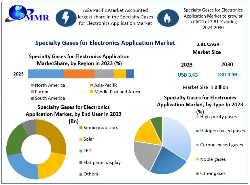 A Specialty Gases for Electronics Application Market size was valued at US $ 3.43 Bn. in 2023 and is expected to reach the US $ 4.46 Bn. by 2030, at a 3.81% CAGR of around during a forecast period.