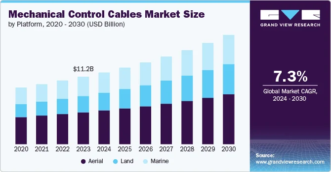 The global mechanical control cables market size was estimated at USD 11.21 billion in 2023 and is projected to reach USD 18.18 billion by 2030, growing at a CAGR of 7.3% from 2024 to 2030. Mechanical control cables, vital for transmitting force and motion, are extensively used in the automotive, aerospace, industrial machinery, and marine sectors.