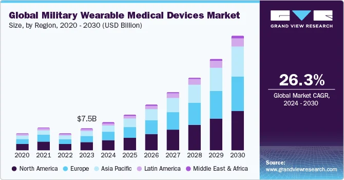 The global military wearable medical devices market size was estimated at USD 7.45 billion in 2023 and is projected to reach USD 38.77 billion by 2030, growing at a CAGR of 26.3% from 2024 to 2030. A key factor driving this market is the increasing investment in research and development of advanced military technologies focused on soldier safety and health monitoring.