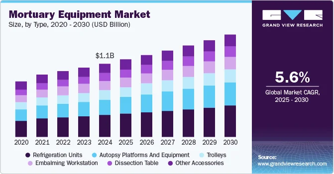 The global mortuary equipment market size was estimated at USD 1.11 billion in 2024 and is projected to reach USD 1.55 billion by 2030, expanding at a CAGR of 5.6% from 2025 to 2030. This growth is primarily driven by the rising death rates, which have resulted in a heightened demand for essential mortuary equipment such as body bags, refrigeration units, and autopsy tables.