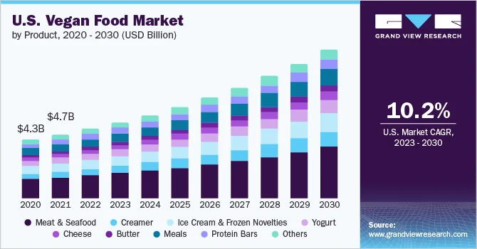 The global vegan food market size was valued at USD 16.55 billion in 2022 and is anticipated to reach USD 37.5 billion by 2030, growing at a CAGR of 10.7% from 2023 to 2030. The primary driver behind this growth is the increasing awareness of the health and environmental benefits associated with a vegan diet.