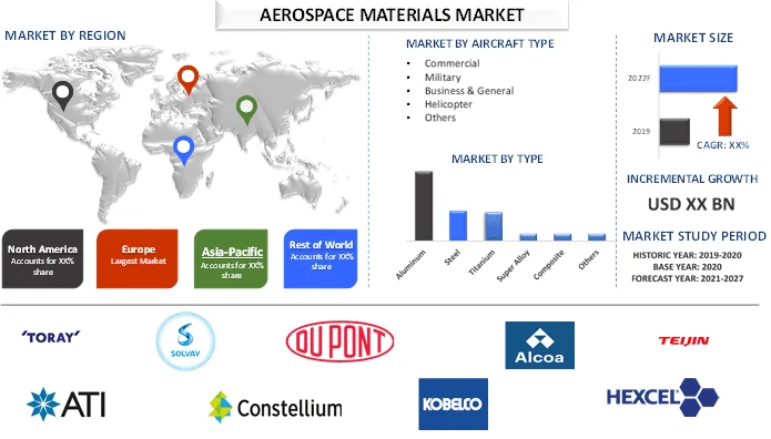 For a better understanding of the market adoption of Aerospace Material, the market is analyzed based on its worldwide presence in the countries such as North America (United States, Canada, Rest of North America), Europe (Germany, UK, France, Spain, and Rest of Europe), Asia-Pacific (China, Japan, India, Australia, and Rest of APAC), and Rest of World. Europe held the prominent share in the market in 2020 owing to large manufacturing of aircraft in the region. Germany, France, and U.K. are among the largest exporter of aerospace products in the world. In 2020, Europe sold the highest dollar value worth of aerospace products onto international markets at 43% of the worldwide total. Some of the major players operating in the market include Toray Industries Inc., Solvay S.A., DuPont de Nemours Inc., Alcoa Corporation, Teijin Limited, Allegheny Technologies Incorporated, Constellium SE, Kobe Steel Ltd., AMG N.V., and Hexcel Corporation.