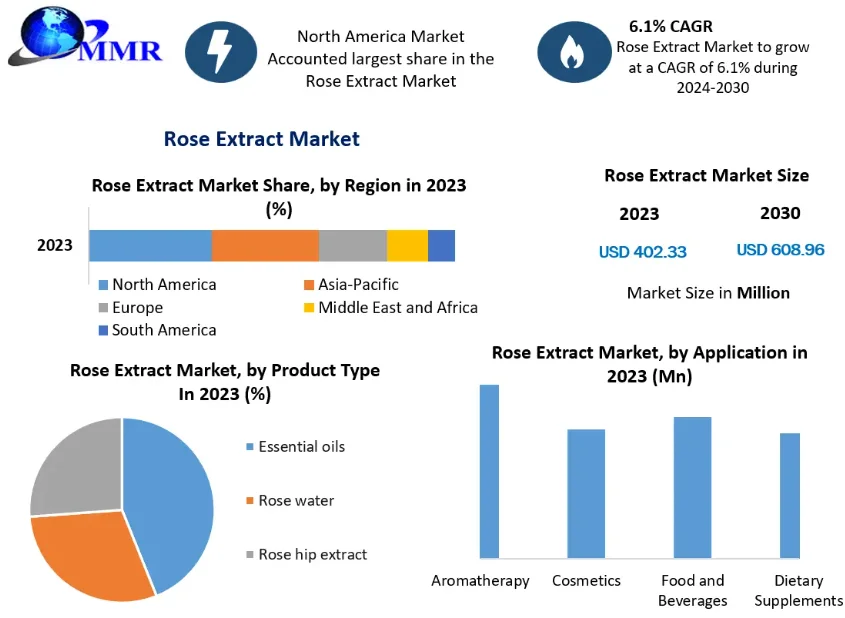 The Rose Extract Industry is projected to grow at a CAGR of 6.1% during the forecast period, from 2024 to 2030, to reach a market size of USD 608.96 million by 2030, up from USD 402.33 million in 2023.