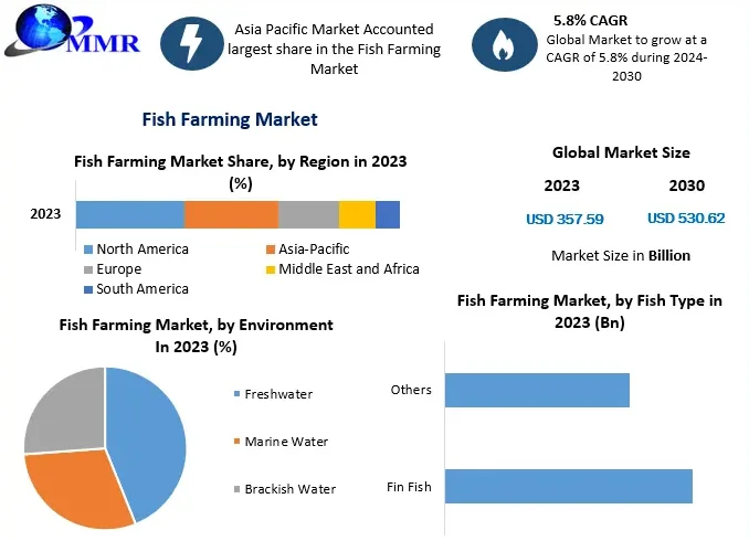 Fish Farming Industry size was valued at US$ 357.59 Bn. in 2023 and the total revenue is expected to grow at a CAGR of 5.8% through 2024 to 2030, reaching nearly US$ 530.62 Bn.